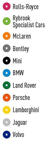 Franchises: Bentley, BMW, Jaguar Land Rover, Lamborghini, Mini, Porsche, Rolls-Royce, Volvo
