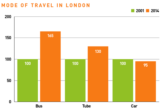 It may come as news to people stuck in London traffic jams, but car usage in London has dropped noticeably in the past 15 years. According to Transport for London (TFL), car usage has gone down by 5%, while bus usage has gone up by 65% and tube use by 30% (see the table, below). The reason is partly congestion (and congestion charges), but it is also due to the Oyster Card, a way of pre-paying for both bus and tube usage – TFL says it has made more difference than all the new lines and stations it has opened. The lesson of London is that people will move out of cars if public transport is made more attractive. This has not been lost on the government, which is now putting £100 million into developing “Intelligent Mobility”.