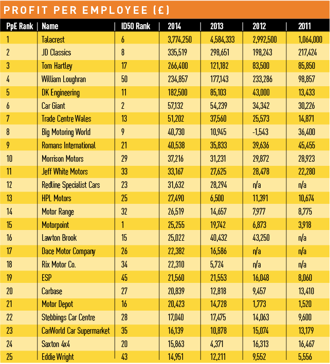 Talacrest, for example, had just four staff in 2014 and earned almost £3.8m profit for every one of them. Its rivals couldn’t come close, but were more than respectable: JD Classics achieved £335,519 profit per staff member and Tom Hartley and William Loughran both achieved more than £200,000.