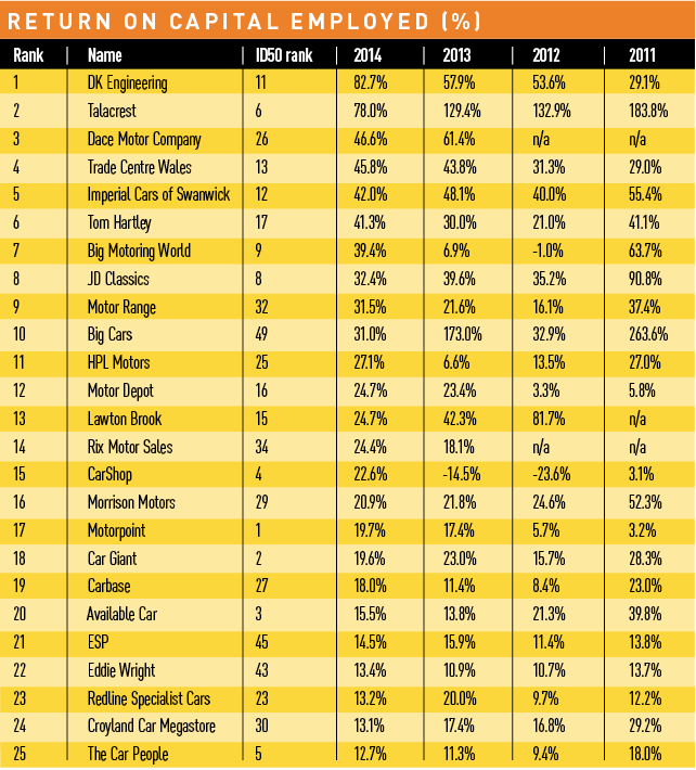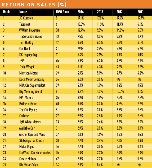 It is perhaps little surprise that a number of the top-performing independent dealers for profitability belong to the supercar specialist club (see table below right). The best return-on-sales figure, 17.1%, was achieved by top 10 ID50 company JD Classics, which has put in a fairly consistent performance over the past four years and is considerably ahead of its peers Talacrest, with 13.3%, and William Loughran, with 12.7%. Unlike those peers, however, JD Classics’ returns ratio has diminished.
