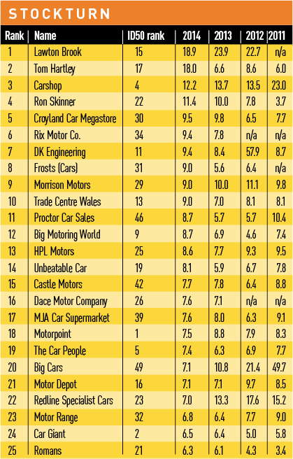 Four of the eight independent dealers whose annual turnover exceeds the £100m mark feature in the top 25 performers for stock turn. Each appears to have a consistent performance too: since 2012, CarShop has turned its stock at least monthly, while Motorpoint, The Car People and Car Giant are consistently shifting stock between 45 and 60 days.