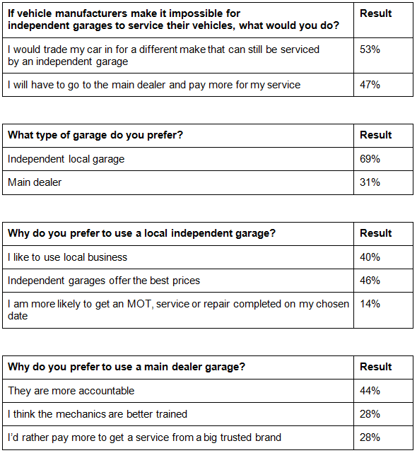 The survey by Servicing Stop found that almost 70% of motorists prefer independent garages over main dealers - 46% believe they offer the best prices, 40% prefer to use local businesses generally, and a further 14% claim they are more likely to have their MoT, service or repair completed on their chosen date.