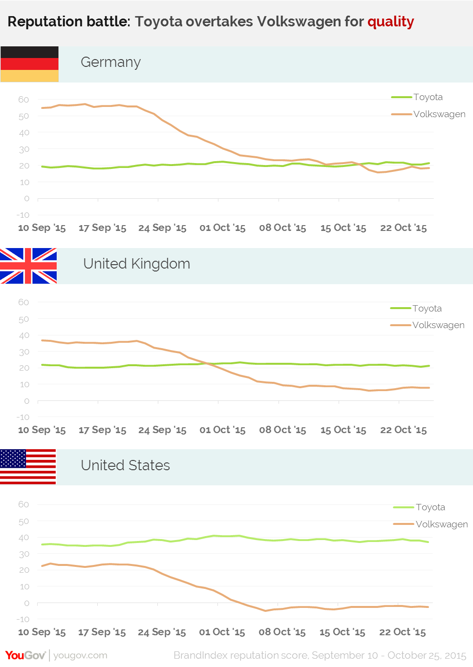 YouGov’s latest brand index rating shows that Toyota, the world’s biggest carmaker, has also overtaken Volkswagen for its reputation for quality.