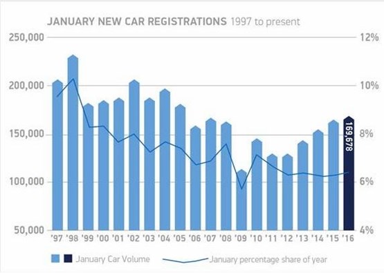 A climb of 2.9% on 2015 makes the first month of 2016 the most successful for car retailers since 2005, when 181,474 new cars registered.
