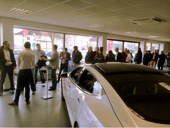 Prospective buyers were lining up at Tesla Stores globally yesterday ahead of the world reveal, including pictured here at the company's dealership in West Drayton near Heathrow.