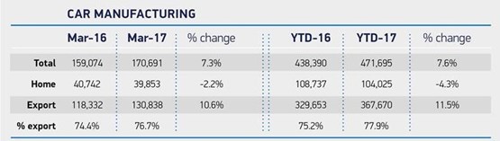 Overseas demand also helped push overall production to a 17-year high in Q1, to 471,695 units – an increase of 7.6%. This helped offset a decline at home, with demand down -4.3% in the quarter.