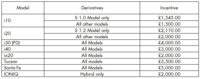 The maximum discount is £5,000 off the price of a Sante Fe, with £3,500 off the Tucson, £3,000 off the i30 and i40, and £2,000 for the Ioniq Hybrid, i20 and ix20. The i10 will also benefit from £1,500 saving.
