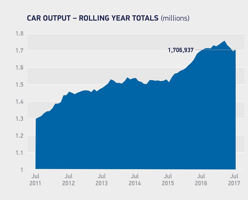 Year-to-date new car production has now passed the one million mark, the SMMT claiming that this showed “a slight dip” of 1.6% compared with 2016 which was, it said, was “in line with expectations”.