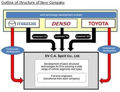 An outline plan of the make-up of the new EV company formed as a result of the new agreement revealed that the Toyota Motor Corporation will contribute 90% of the venture’s 10 million Yen funding, with Mazda and Denso contributing 5% each, respectively.