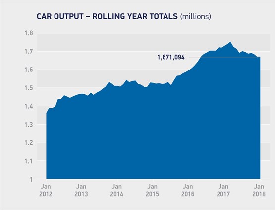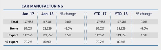 The SMMT said that just 72 fewer cars were produced during January 2018, compared to the same period a year earlier, as exports grew 1.5% to a record 119,252.