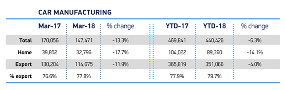 A total of 147,471 cars rolled off UK production lines in March, down 13.3% on same month in 2017, as demand fell for the eighth consecutive month – by 17.7% – in the home market and exports fell by 11.9%.
