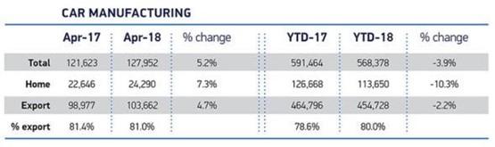 A 5.2% uplift in UK car manufacturing outputs during April was not enough to arrest a double-digit decline in supply for the domestic market since the start of the year, the SMMT has reported.