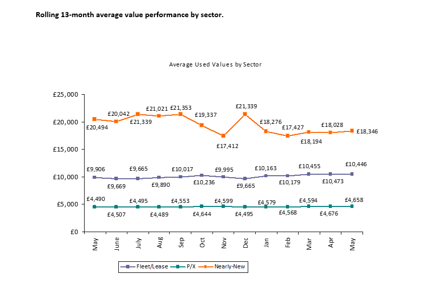 Values for nearly-new vehicle values rose by £318 in May to £18,346, equivalent to a 1.7% increase. Model mix has a significant effect in this low volume sector.