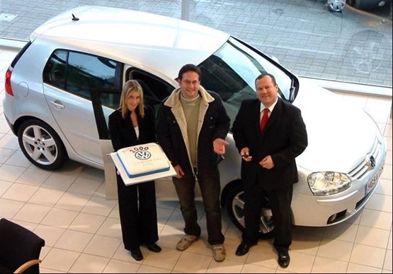 Pictured: Martin Pye and Jennie Mitchell from Breeze Volkswagen celebrate its 1,000 sale in 2004 with customer, Ian Walker.