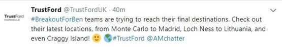 A Tweet from the Ford of Britain-owned group’s Twitter account this morning wished them well in their final few hours of the mile-munching challenge.