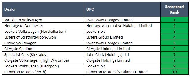 The top ten best-scoring Volkswagen franchised sites were: