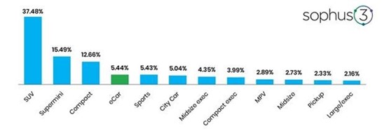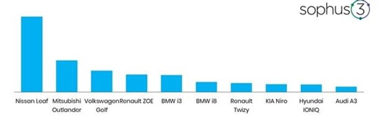 The Mitsubishi Outlander PHEV comes in a very strong second, followed by the VW e-Golf, with the remaining electric cars in Sophus3’s analysis of top ten performers indicating strong interest in car brands’ bespoke electric offerings over straightforward electric versions of existing ICE cars.