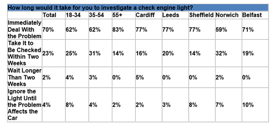 The results found that of the 2,000 asked 29% will ignore warning lights until a more convenient time, while 23% will wait for up to two weeks before having the vehicle checked.