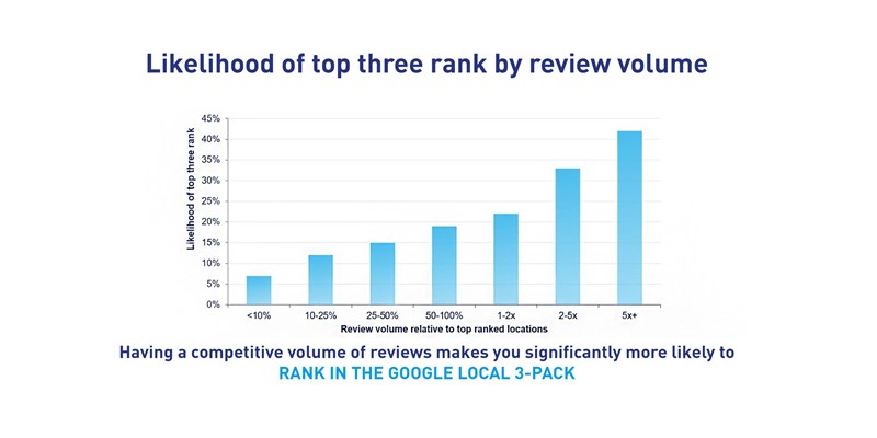 To reach the coveted top three results, also called Google Local 3-Packs, you need a larger review volumes than your local competition. As shown on graph 1, with twice more volume that the competition, you are 30% more likely to appear in the Local 3-Pack on category search (i.e. ‘car dealer near me’).