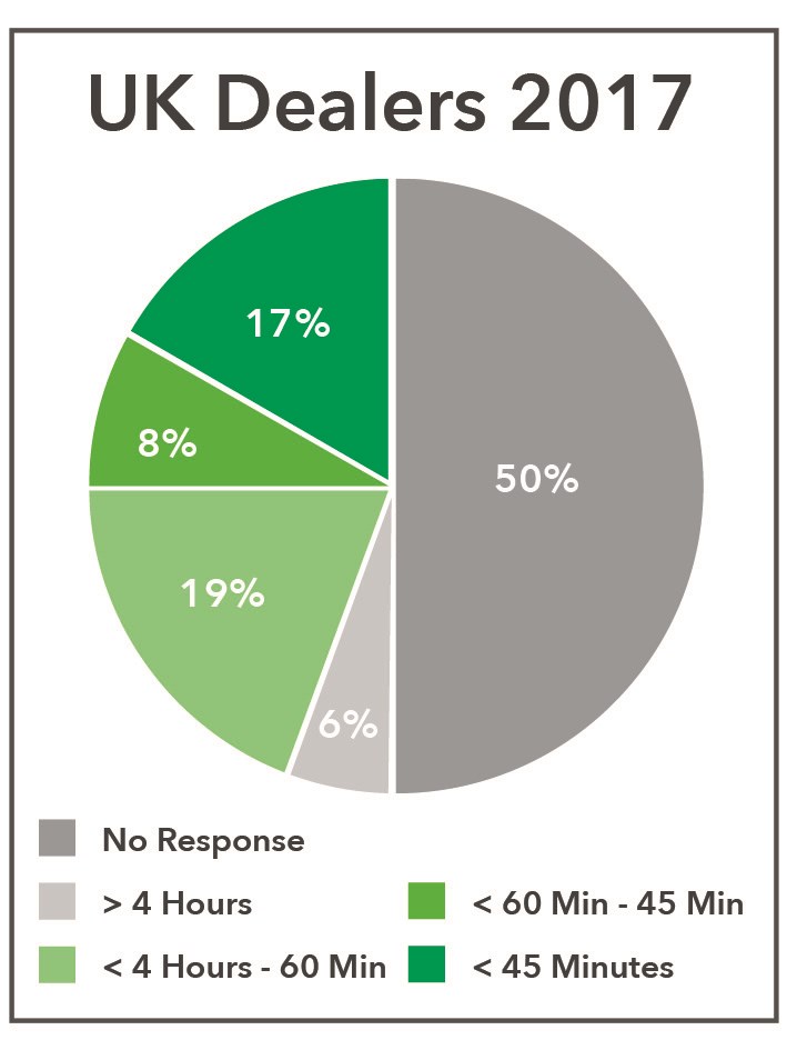 Our study of hundreds of dealers across 21 franchises in the UK (see chart) showed 50% didn’t respond within 24 hours, 6% took over four hours and 19% took between an hour and four hours to get back to a customer. The remaining quarter responded within an hour.