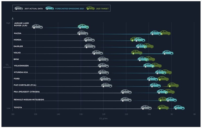 The annual ‘Driving into a low emissions future’ report published this week predicted that Volkswagen, Ford, Fiat, PSA, BMW, Daimler, Mazda and Hyundai-Kia would all miss their specific 2021 emissions targets.