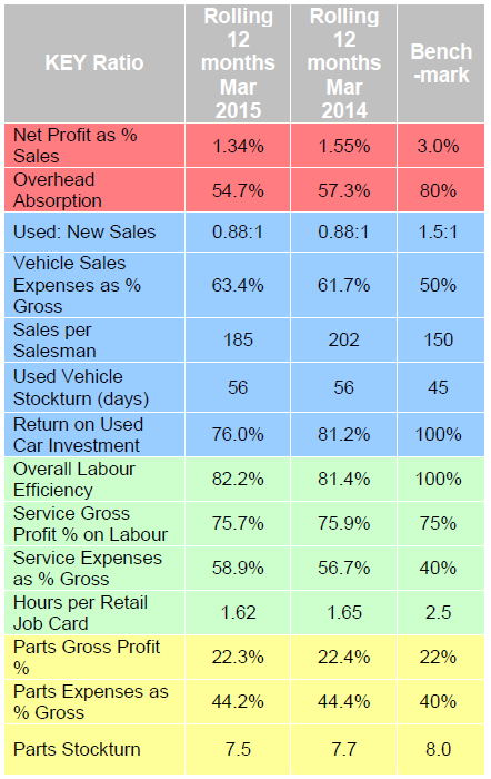 Looking at new car sales the average dealer sold the same number of vehicles in March 2015 as they did in the prior year, with a marginal decline in the quarter as a whole.