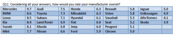 With a score of 2.7 both Volkswagen and Skoda had the lowest scores for this question.