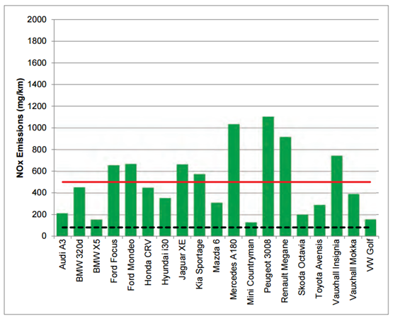 The below graph show the results of 'real world' test, the red line marking the average NOx emissions results from Euro 6 vehicles of 500 mg/km, which is over six times higher than the 80 mg/km official legislative NEDC laboratory test limit marked in black.