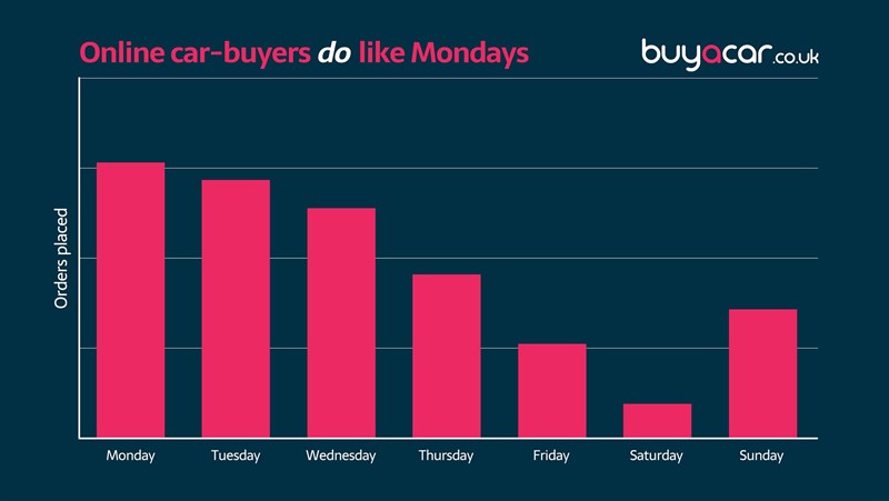 Buyacar.co.uk believes the concentration of online car purchases early in the week probably follows weekend research and test drives, boosting consumer confidence to make their purchase decision very soon after.