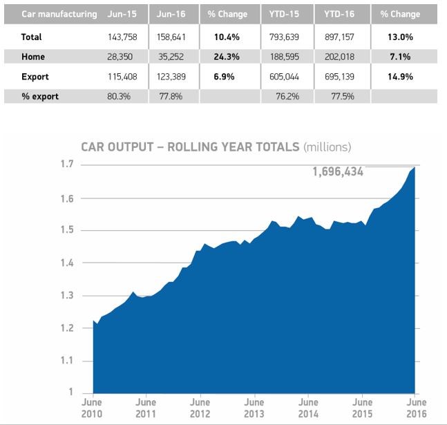 The UK car manufacturing sector finished the first half of 2016 with 158,641 units produced in June marking a 10.4% month-onmonth rise and a 897,157 total across the six-month period, up 13.0% on 2015.