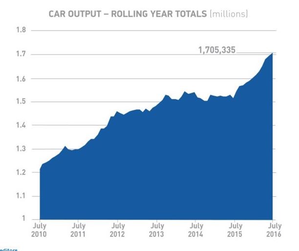 Over one million cars have been built so far in 2016, with July marking the 12th consecutive month of growth for the sector, according to the SMMT.