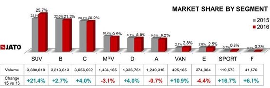 In contrast, traditional segments grew by just 2.2% with European consumer preferences shifting further towards SUVs, and away from hatchbacks, saloons, estates and MPVs.