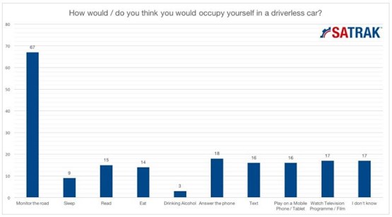 When asked what they might do while travelling in a driverless vehicle, 67% of respondents admitted that they would still watch the road over other options such as reading, eating, or playing on a mobile device.