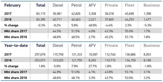 Demand for new cars in February suffered a 0.3% decline year-on-year to 83,115 registrations.