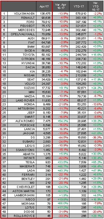 FCA Group and Toyota were the biggest market share winners in April, meanwhile, with 0.45% and 0.37% gains taking their respective share to 7.23% and 4.33%.