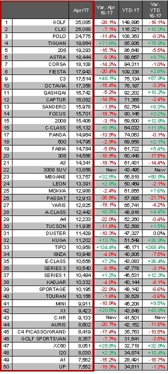 The Golf regained its position as Europe’s most popular car, after losing its title to the Ford Fiesta in March, while the Peugeot 3008 made the largest gain in terms of market share, becoming the fifth best-selling SUV.