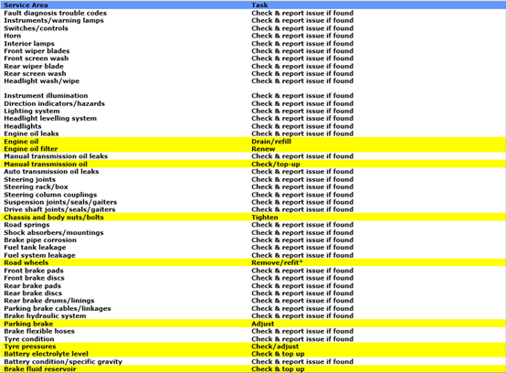 The following is an example of a typical car service schedule; items in yellow are not covered by the MoT.