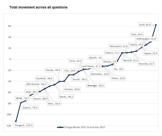 “Although average scores across the majority of the questions have generally declined, some networks continued to perform well following recent success and others showed significant improvements. Notably, Kia reached the first place in the all-important question and Audi recorded the highest increase in score across all the questions of the survey.