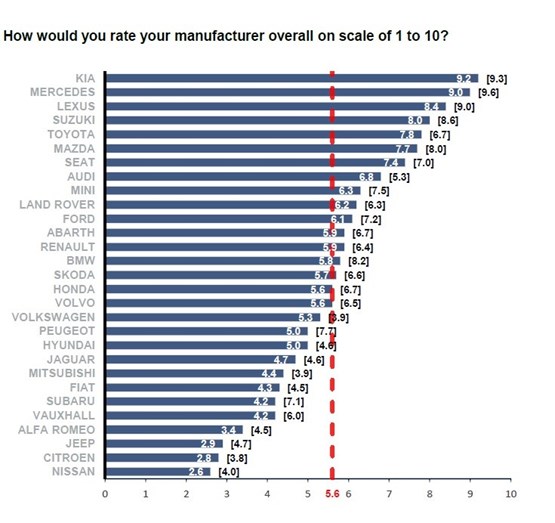 The most dissatisfied dealer networks were Jeep (2.9), Citroen (2.8) and Nissan (2.6).