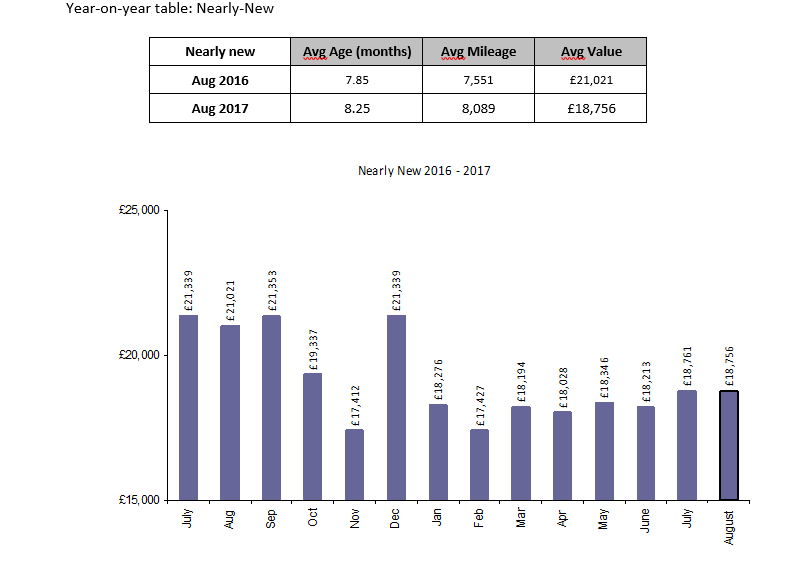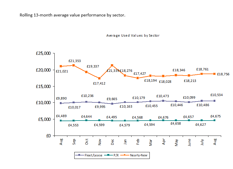Values for nearly-new vehicle values were effectively static in August, down by just £5 to £18,756. Model mix has a significant effect in this low volume sector.