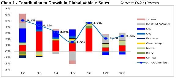 China and India will boost worldwide sales growth in 2017 and 2018 as the market approaches 100 million new vehicle sales despite ongoing decline in the US and UK markets, according to Euler Hermes.