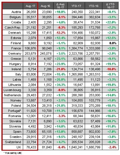 Good results in France (up 9.1% to 106,976), Italy (up 15.4% to 83,806) and Spain (up 13% to 73,600) all helped to make up for a fall in registrations experienced in the UK.
