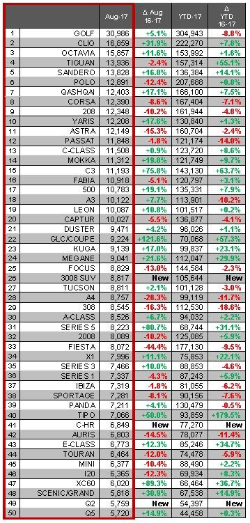 Other high performing models for August were the Renault Clio, Dacia Sandero, Nissan Qashqai, Toyota Yaris, Vauxhal/Opel Mokka, Citroen C3, Fiat 500, Seat Leon, Jeep Compass, Volvo XC60, BMW 5-Series, Nissan Micra, Ford B-Max, Fiat Tipo, Nissan X-Trail and Mini Countryman.
