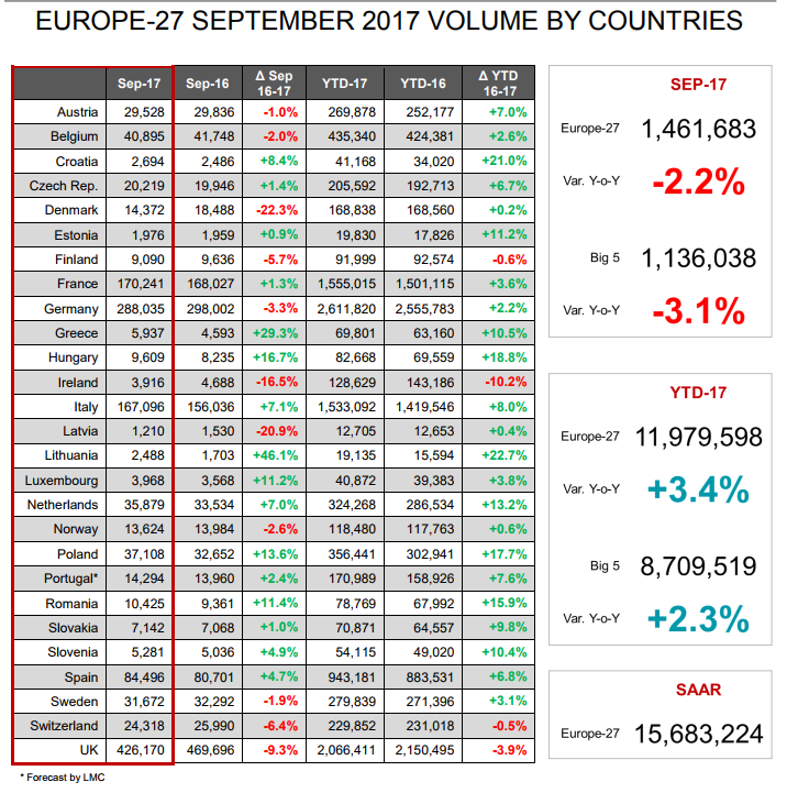 New registrations for the month totalled 1,461,683 units – a decrease of 2.2% when compared to the same month last year – as 11 of the 27 markets analysed suffered shrinking sales.