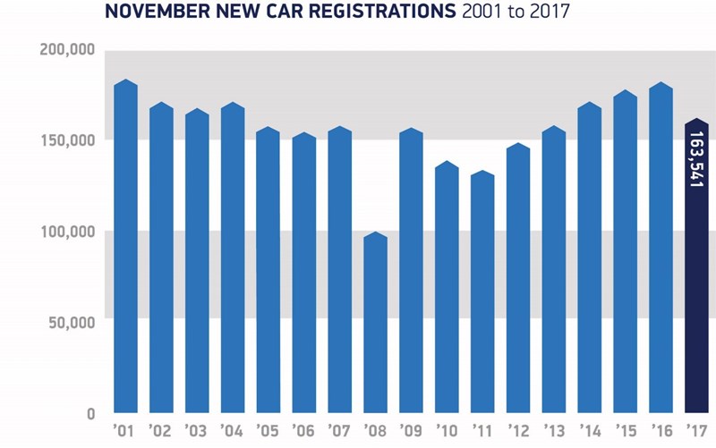 New car registrations have continued their decline with November’s 11.2% year-on-year fall marking the eighth consecutive month of falling sales.