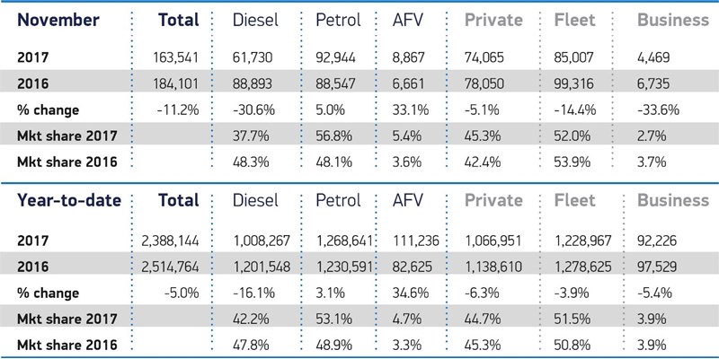 Alternatively Fuelled Vehicles (AFV) sector continued to make significant gains in November, growing by 33.1% (8,867), but still only claimed a 5.4% market share.