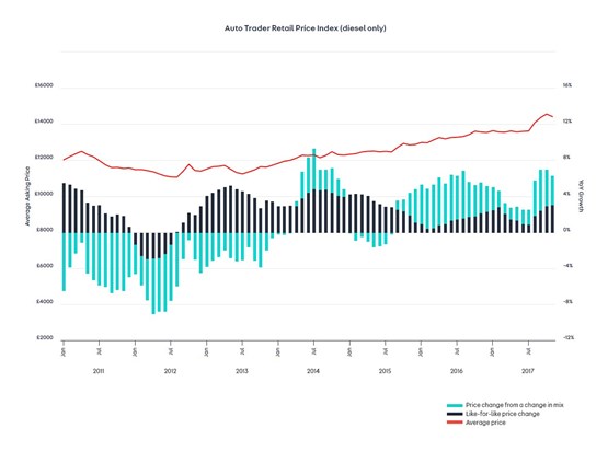 Overall, prices remained 6% up on the same point in 2016, with diesel vehicles maintaining a 3% increase in prices year-on-year, however, as petrol vehicles rose 11%.