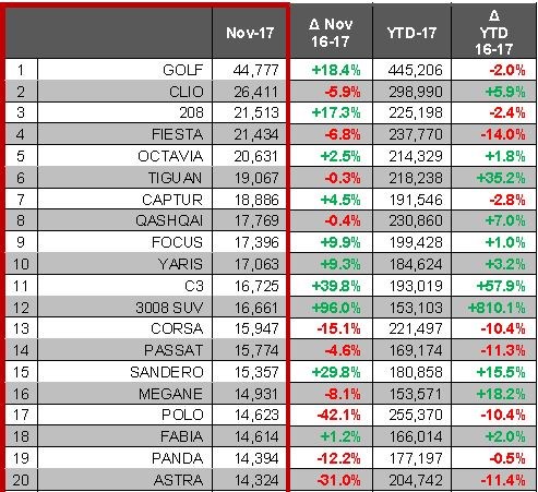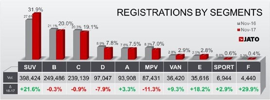 “Already we have seen the effects of this on MPVs, which recorded a market share of just 7% in November 2017, thanks to a fall in volume of 11.3% to 87,400 units.