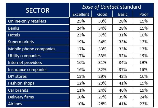 It canvassed 2,000 UK consumers, asking whether they felt that companies in a variety of sectors were easy to get in touch with and efficient at getting queries resolved rapidly and effectively.