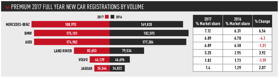 Mercedes-Benz took the UK premium brand crown in 2017 due to gains over competitors in the fleet market.